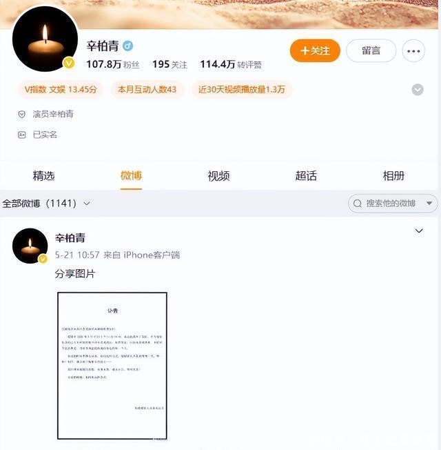 而留下的辛柏青,实在难以想象,他该如何去走出这段持久的悲伤。 从朱媛媛刚走的时候,朋友对于妻子的离开不敢相信,纷纷询问他时。 辛柏青没有多余的话语,一个白色蜡烛足以代表一切。 而辛柏青的社交平台,好似也因为妻子的离开,再也无心打理。 里面的内容还停留在媛媛离开的讣告,以及那个黑白的蜡烛头像。
